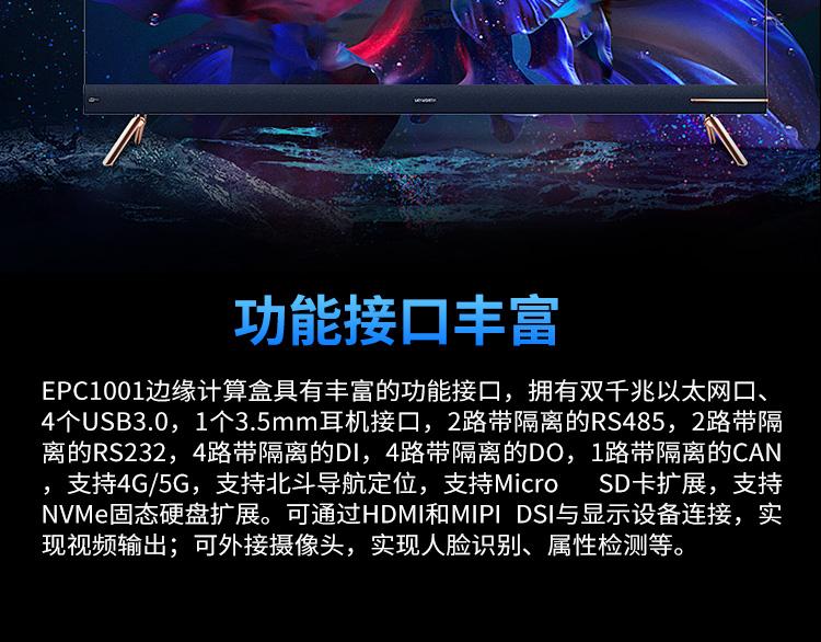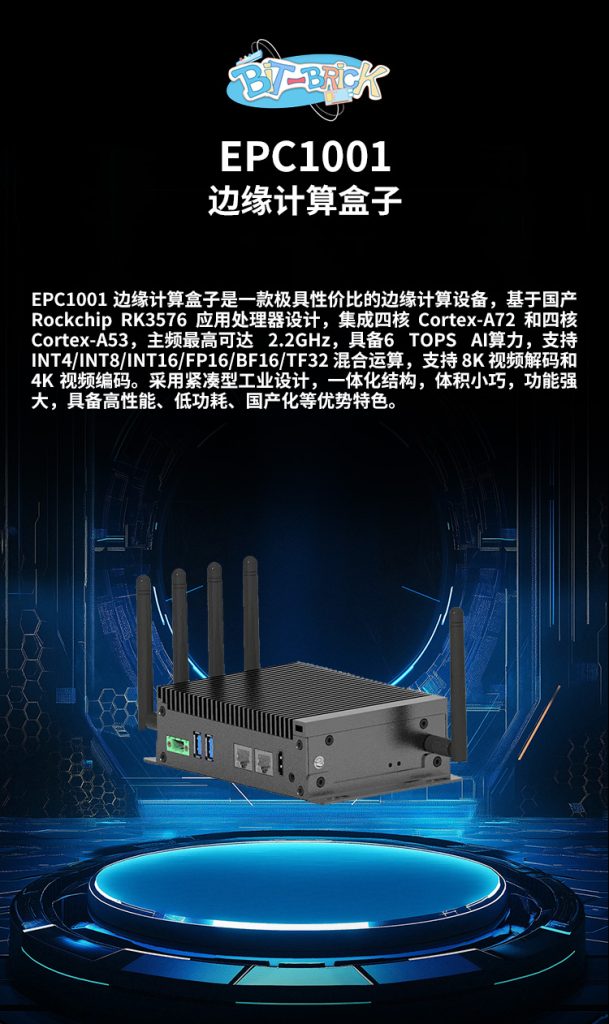 EPC1001边缘计算盒 EPC1001边缘计算盒是一款极具性价比的边缘计算设备,基于国产Rockchip RK3576应用处理器设计,集成4核Cortex-A72和4核Cortex-A53,主频最高可达2.2GHz,内置6 TOPSNPU,支持 INT4/INT8/INT16/FP16/BF16/TF32混合运算,支持8K视频解码和4K视频编码。采用紧凑型工业设计,一体化结构,体积小巧,功能强大,具备高性能、低功耗、国产化等优势特色。 文档 下载 立即购买